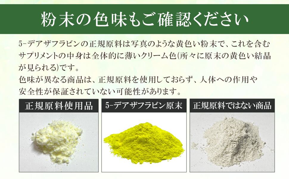 5-デアザフラビン(国内製造)、オリーブ油/結晶セルロース、HPMC、ステアリン酸カルシウム、二酸化ケイ素、着色料(二酸化チタン)、グリセリン脂肪酸エステル、グリセリン